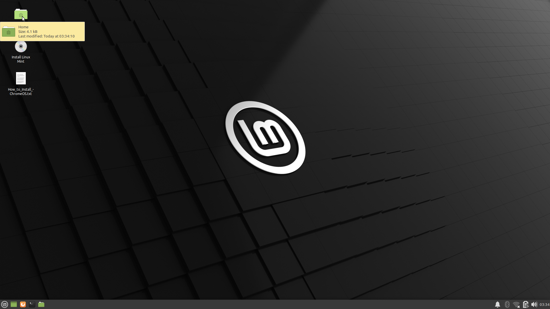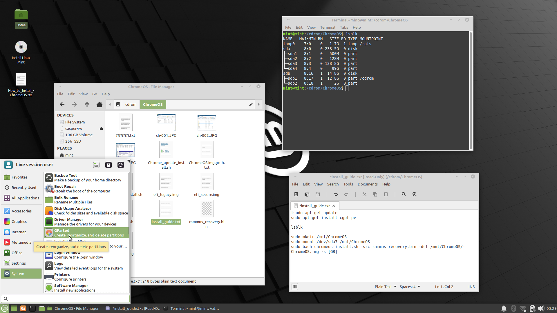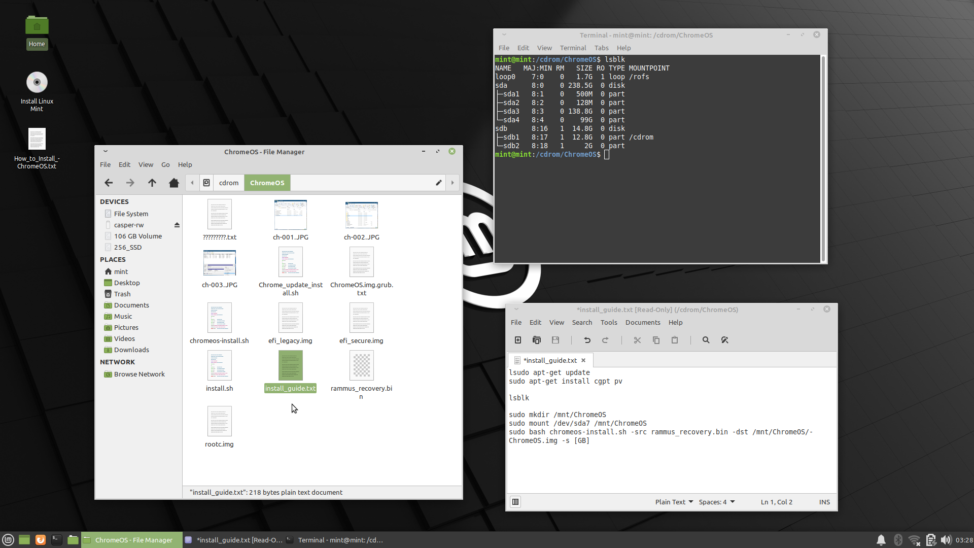 Linux Mintが起動したら、USBメモリのフォルダを開きます。デスクトップにあるHomeアイコンからフォルダを開いて2つ上の階層へ上がっていくと「cdrom」というフォルダがあります。これを開くと先ほどのUSBの中です。この中のChromeOSフォルダの中から「install_guide.txt」を開きます。続いてCDROMフォルダの中で右クリックしてターミナルを開きます。(Open in Terminal)