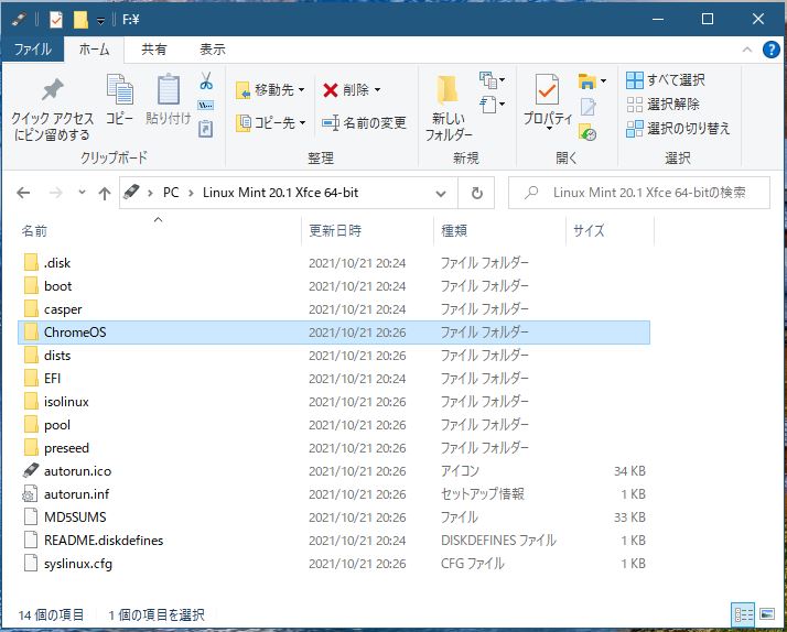 以上のファイルをLinuxのブート用USBメモリに移動します。USBメモリに「ChromeOS」というフォルダを作りその中へすべてのファイルをコピーします。