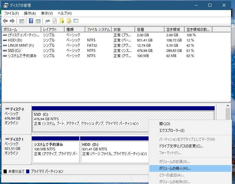 今の時点ではSSDはWindowsのCドライブと回復ドライブでしょうか。デュアルブートしてみようという方ならおわかりいただると思いますが、Cドライブを縮小して領域を空けます。128GBのSSDだとチョイ厳しいですがスマホが64GBでイケますのでとりあえず60GB位取れれば十分かと。慣れるとインストール簡単ですから、あとでWindowsを大きくしたりできます。(C:)のところで右クリックしてボリュームの縮小をして空けたところに新規のパーティションを作成しておきます。形式は[ntfs]でいいです。