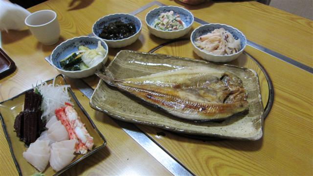 夕飯は、本場のホッケ定食。イルカのお刺身を頼んだらいっぱいオマケして