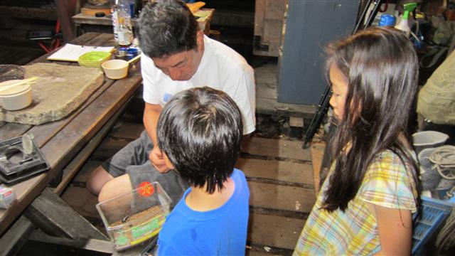 子供達は昨晩キャンプ場オーナーと約束した亀を見せてもらったり