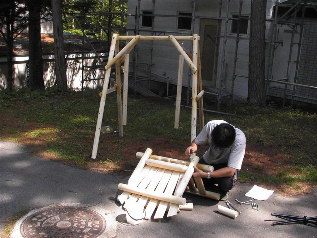 早朝から釣りに出て、ブランコを受取り、白木のテーブル・ベンチと共に