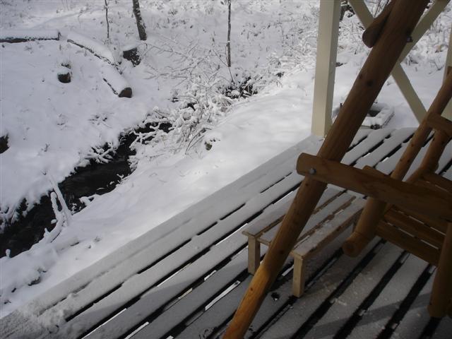 春のせせらぎと降雪の朝。動画でどうぞ。