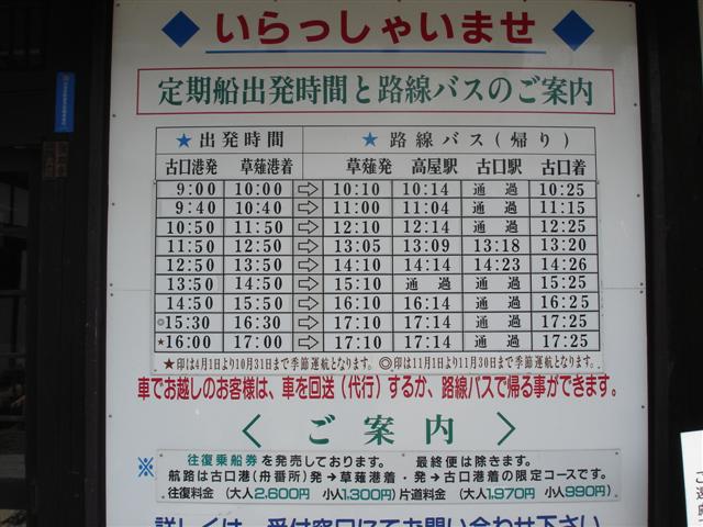 参考までに定期船の時刻と路線バスの接続時間等を。クリックで拡大(2009.08現在)