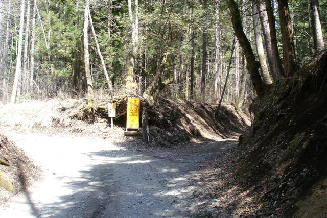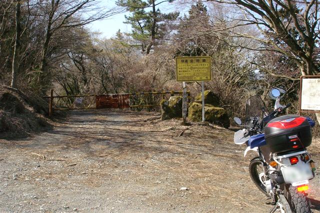 と、林道分岐を発見。林道大沢線です。4輪車止めのゲートが