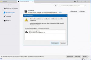 ドイツ語版を再度起動して、「メニュー」-「アドオン」で開いたタブページ上部の歯車をクリックして「ファイルからアドオンをインストール」を選んで先ほどの「ja.xpi」をインストールします。(なんか「はい」「いいえ」のようなダイアログが出ます。もちろん左側の「はい」らしき方で・・・(笑)